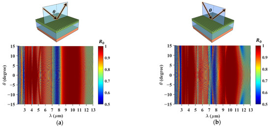 To investigate the angular tolerance of the double-sided metasurfaces, we examine the dual-band reflection while varying two different angles. Figure 5a illustrates angular variation with the plane of incidence (POI) perpendicular to the grating grooves of the first reflector. In this case, the MWIR reflector is subjected to classical mounting while the LWIR reflector experiences fully conical mounting. In general, the classic incidence varies the resonance more since it induces greater deviation of the diffracted waves than conic incidence [21]. Likewise, as shown in the color map, it is observed that the MWIR reflection band is split under classic mounting, but the LWIR reflection band remains robust under fully conical mounting. When the POI is parallel to the grooves, as seen in Figure 5b, the first reflector undergoes fully conical mounting, thereby enhancing angular tolerance in the MWIR band. However, reflectance is somewhat degraded in the LWIR band due to the classical mounting of the second reflector for this case.