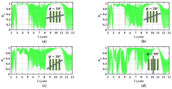 Figure 2c shows a double-sided metasurfaces composed the of two individual reflectors from Figure 2a,b. The substrate thickness (d) is set to 1 mm, which is a commonly used value. To ensure that each reflector operates with the proper polarization, two 1D grating are aligned in orthogonal directions under linearly polarized light illumination. When the incident electric field is perpendicular to the first grating grooves, the first and second metasurface interact with TM and TE polarized electromagnetic waves, respectively. The simulation result of the R0 spectrum clearly shows dual MWIR and LWIR reflection with high fluctuations due to Fabry-Pérot (FP) resonances.