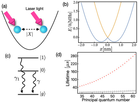 Following the scheme in our previous work [30], we engineer a CI in a system of two Sr+ ions in a linear Paul trap. The setting is depicted in Figure 1a. The ions form a two-ion crystal and vibrate around their equilibrium positions [57]. Both ions are laser excited to Rydberg states coherently [40]. One ion is in Rydberg energy level and the other is in the state, where n is the principal quantum number. In Rydberg states, the ions interact strongly via a long-range dipole–dipole interaction. Due to the spatial dependence, the dipole–dipole interaction between Rydberg ions couples to the breathing mode of the ion crystal [57]. Using an additional static electric field and exploiting the state-dependent polarizability of Rybderg states, we create two linear couplings perpendicular to each other, forming a peaked (symmetric) CI as shown in Figure 1b. More details on the derivation of the CI can be found in ref. [30]. The atomic properties of Sr+ ions are based on a model potential calculation [58]