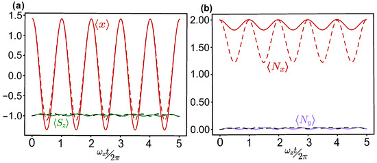 Due to the spin–vibronic coupling, particularly and the choice of the initial state, oscillates around nm while remains zero. This means that the phonon wavepacket shows a localization around the initial location but not a tunnel to the other minimum at , despite the energies at the two symmetric minima being degenerate. This results from the geometric effect, where the phonon wavepacket will gain a phase shift when encircling the conical intersection. This phase leads to destructive interference such that the wavepacket at the opposite minimum vanishes [10,30]. When the coupling is weak, there is no significant change in the phonon number in both the x and y directions as shown in Figure 2b. Increasing the coupling results in a larger amplitude of oscillation of . Here, the variation in the expectation value does not change significantly with the change in the coupling and exhibits small oscillation around . This value is close to the initial state. The phonon fluctuations are relatively small, whose value is related to . This is due to the parity symmetry, i.e., , where , is the parity operator [61,62]. Hence, () is a conserved quantity. See Appendix A for details.