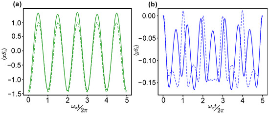 One can find that the spin and phonon dynamics are strongly correlated. Figure 3 shows correlations between the spin operators corresponding to Rydberg states and vibrational modes. The spin operator only couples with the x phonon. One finds that the expectation value oscillates as shown in Figure 3a. Average values of the spin operators with the y phonon are non-zero (Figure 3b) due to the coupling . Correlations and become stronger by increasing the coupling and as shown in Figure 3a,b. We note that other correlation terms, such as , , and are zero, as the coupling does not generate the correlations between the spins and phonons in these directions.