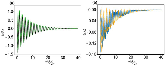 An interesting effect is observed for both the average phonon number and as shown in Figure 4b. Though there is no phonon loss term in the dissipative process in the master equation, the coupling with the spins makes the average phonon number decrease with time. It attains the steady state value and at a longer evolution time. The parity symmetry of the Hamiltonian, on the other hand, is broken in the master equation due to the decay in Rydberg states such that in the steady state. Increasing the coupling to MHz, one finds larger amplitudes in the expectation value of the x phonon mode that decreases with the time, as can be seen in Figure 4b. It is clear that the average phonon number in the x phonon mode is larger compared to the y phonon mode. This is largely due to the choice of the initial state, i.e., and . Initially, the y phonon is in the ground (zero phonon) state, which is hardly affected by the spin–phonon coupling.