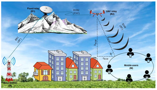 Figure 1, we consider a triple-hop UAV-based RF-FSO system model with a decode-and-forward (DF) relay scheme, where multiple mobile users are out of the coverage area of the base station and one fixed relay and the other UAV relay is used for the transmission from the base station (B) to the multiple mobile users
