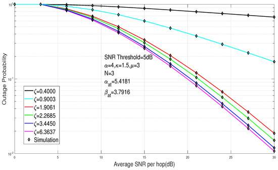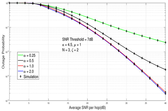 Figure 6 is simulated for different values of the nonlinearity parameter and alpha against the outage probability as a function of the average SNR. The threshold value is assumed to be 7 dB. It can be clearly seen from the figure that as we increase
