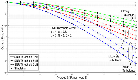 Figure 3 with respect to the average SNR per hop for different SNR threshold values under various turbulence levels. The SNR threshold is assumed to be 2 dB and other parameters are assumed as