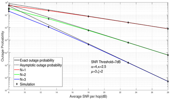 Figure 4 shows the plot of the exact and asymptotic outage probability against average SNR value with ranging number of users. It can be noticed from the graph that exact and asymptotic outage probabilities are matching exactly at the higher SNR values, which validates the numerical analysis. It is observed that as the number of users increases, outage performance is improved. For example, for N = 1, 2, and 3, the outage probability is 0.1466, 0.0215, and 0.0031, respectively. Additionally, to demonstrate the combined effect of both average SNR per hop and number of users N, we have plotted a 3D graph of outage probability against the average SNR per hop and number of users in