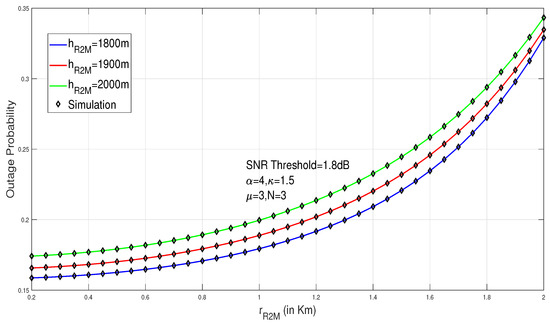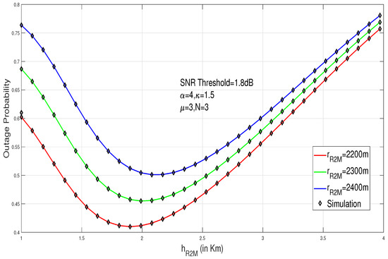 Figure 7. The graph is simulated by assuming an SNR threshold of 1.8 dB. The impact of the horizontal distance between the UAV relay R2 and the selected mobile user is seen on the outage performance of the system. It can be noticed from the curve that, as we increase the UAV altitude, the outage probability decreases at first and after a certain optimum value of the UAV altitude, the outage probability starts increasing. Hence, initially, the outage probability of the RF/FSO system is minimized. However, if we further increase the UAV altitude, the outage probability increases abruptly, thereby lowering the system performance. Hence, at a higher altitude, there is an increase in path loss and atmospheric losses, due to which the overall performance of system deteriorates. Therefore, we can conclude that optimal altitude is need to be obtained so as to reduce the overall outage probability of the system and to improve system performance.