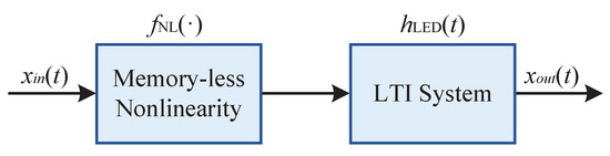 In [48], the author demonstrated that the Hammerstein model is more effective than the Wiener model for describing LED nonlinearities. We have adopted this model, which consists of a memoryless nonlinear module followed by a linear time-invariant (LTI) system (see Figure 2).