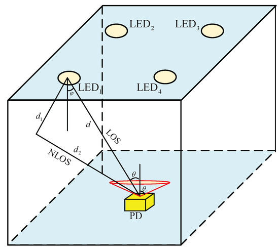 where represents the transmitter’s signal power. It is assumed that only the LOS link component in the VLC channel is considered, and the normal vector of the PD at the receiver is perpendicular to the horizontal plane. When the incidence angle of the PD is smaller than its field of view (FOV), the channel gain can be expressed as