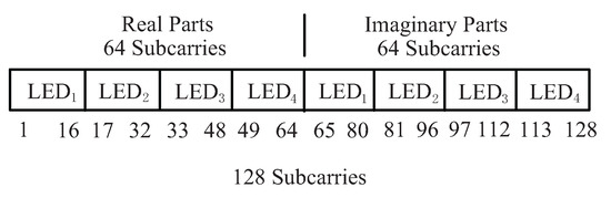 Subcarrier allocation in the fractional Fourier domain for 4-LED VLC and VLP systems.