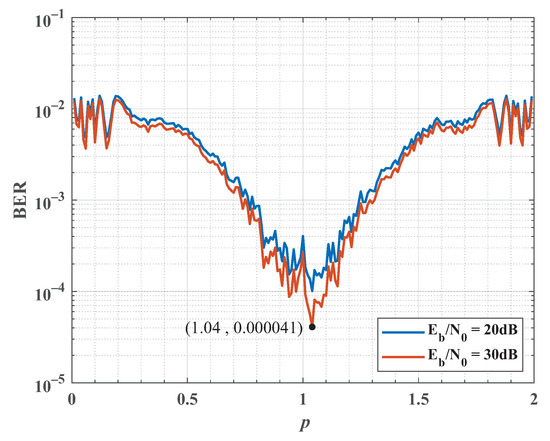 We first assume that the receiver’s PD is located at (1, 1, 0.8). From Section 2.1 and Equation (2), we know that the FRFT is a periodic function. Specifically, when the transform order p spans a range of 2, the transform can cover the entire time–frequency domain, transitioning from the time domain to the frequency domain. Based on this, we selected a range of for traversal and used 4-QAM to determine the optimal transform order p in this environment. We transmitted 20,000 FRFT-OFDM signals, each containing 64 bits, resulting in 12,80,000 bits sent for each p calculation. Figure 5 shows the relationship between the BER performance and the transform order p at fixed levels of 20 dB and 30 dB. Notably, the BER trends are similar for different p values with both settings. From the trend of the BER curves in Figure 5, it is evident that the transform order p corresponding to relatively low BER values is concentrated around . This suggests that the nonlinear effects of the LED and the limited bandwidth have a minimal impact on the overall BER of the VLC system. In other words, the BER corresponding to the optimal order p does not differ significantly from the BER at . Specifically, the lowest BER observed at dB is for , while the BER for is approximately . Thus, the optimal order p in this scenario is determined to be 1.04.