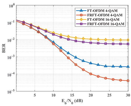 Figure 6 presents a comparison of BER performance between the FRFT-OFDM scheme at the optimal order p and the FT-OFDM scheme across various modulation modes. As illustrated in the figure, both systems exhibit similar BER performance when dB, regardless of the modulation scheme used. However, in higher- environments, the FRFT-OFDM scheme shows significant improvements over the FT-OFDM scheme. For instance, with 4-QAM at dB, the BERs for the FRFT-OFDM scheme and FT-OFDM scheme are and , respectively. In the case of 16-QAM, although both systems experience degraded BER performance due to the increased number of modulation bits, the FRFT-OFDM scheme still demonstrates a notable advantage in BER performance compared to the FT-OFDM scheme in higher- scenarios.