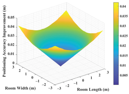 Figure 9 illustrates the improvement in positioning accuracy of the FRFT-OFDM scheme with the optimal order p compared to the FT-OFDM scheme for various indoor locations. It is evident that the FRFT-OFDM scheme achieves varying degrees of improvement in localization error across nearly all positions. Table 2 presents the localization errors of the FRFT-OFDM scheme at specific locations, along with the improvement in positioning accuracy compared to the FT-OFDM scheme. Combining this with Figure 8, we observe that when the receiver is very close to the center of the room, the increased power from direct LED reception leads to better positioning accuracy for the FT-OFDM scheme, with minimal improvement from the FRFT-OFDM scheme in this scenario. When the receiver is positioned close to the wall, the power of the received direct light is significantly reduced, resulting in a marked increase in localization error for both the FRFT-OFDM and FT-OFDM schemes. However, even in this scenario, the positioning accuracy of the FRFT-OFDM scheme remains notably superior to that of the FT-OFDM scheme. Overall, the FRFT-OFDM scheme demonstrates strong positioning performance in most scenarios, achieving localization errors of less than 10 cm and improvements of over 1 cm compared to the FT-OFDM scheme.
