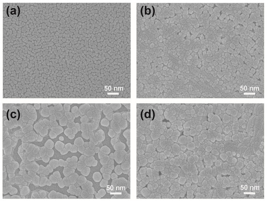 SEM images for the surface morphology of the VO2 films with thickness of (a) 28 nm, (b) 59 nm, (c) 86 nm, and (d) 130 nm.