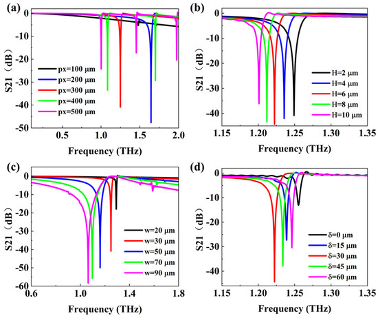Influence of the parameters of the THz metamaterial temperature sensor unit structure. (a–d) illustrate the effects of the unit structure period, substrate thickness, Cu strip width, and asymmetry on the S21 parameters, respectively.