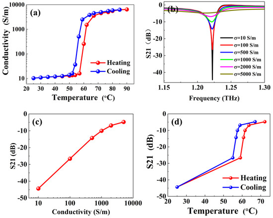 Vanadium dioxide (VO2) is a material that undergoes a reversible insulator-metal phase transition at approximately 68 °C [35]. During this transition, VO2 undergoes a first-order phase change from a high-temperature metallic state to a low-temperature insulating state, accompanied by a dramatic change in conductivity of four to five orders of magnitude [36,37]. This characteristic positions it as a promising candidate for temperature sensor applications. This paper systematically investigated the performance of THz metamaterial temperature sensors modulated by VO2 thin films, utilizing a double-layer asymmetric structure (DLAS) composed of two copper strips, highlighting the advantages of a simple structure and high sensitivity. The results indicated that when the conductivity of the VO2 thin film varies within the range of 10 to 5000 S/m, the S21 parameter varies from −44.33 to −4.78 dB at 1.22 THz, achieving a modulation depth of up to 89%. In addition, the 86 nm thick VO2 film underwent a phase transition in the temperature range of 54.93 °C to 66.93 °C, achieving a sensitivity of 1.82 dB/°C for temperature sensing.