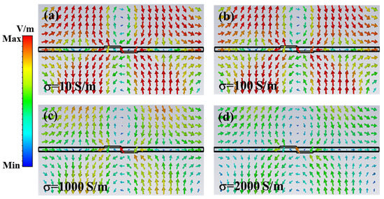 The electric field distribution maps at 1.22 THz for varying conductivities, with conductivities of 10, 100, 1000, and 2000 S/m, respectively, the arrow indicates the direction of the electric field.