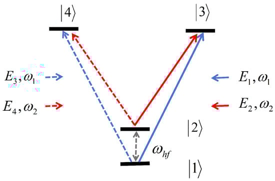 In Equation (1), is the wave vector, is wavelength, and c is the speed of light in vacuum. In the rotating coordinate system and Raman resonance, when , where is the hyperfine transition frequency of the ground state, the dark state prepared by the pump beam is [17]