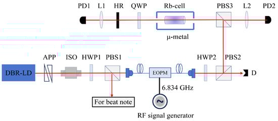 The experimental setup is shown in Figure 2, and involves the Doppler effect occurring within a cylindrical gas cell that contained rubidium atoms with natural abundance. The vapor cell has a diameter of 25 mm and a length of 75 mm, without any buffer gas. The vapor cell is placed in a metal magnetic shielded and kept at room temperature. In this experiment, we use a narrow linewidth DBR laser from Photodigm that comes in TO-8 packaging, and can be tuned to the D1 line of rubidium atoms. The laser beam is shaped using the anamorphic prism pair and fully isolated by an optical isolator before being split into two beams using both a half-wave plate and polarization beam splitter 1. One beam is used for subsequent beat note experiments while the other beam connects to an EOPM with fiber input and output. We used a microwave source (Agilent, Model E8257D) to generate a 6.834 GHz RF signal to drive the EOPM. Monitoring of these optical sidebands occurs via a temperature-controlled optical etalon made of fused silica optical glass with specific properties: refractive index of 1.453, thickness of 2.5 mm, coating reflectivity at 98%, and a free spectral range of 40 GHz. To enhance the frequency stability of the microwave source, we employ the Rubidium atomic clock (SRS, Model FS725). Before entering the cell, the beam passes through a half-wave plate and two polarizing beam splitters in order to ensure power control and linear polarization into the cell. Subsequently, upon exiting the cell, the beam traverses a quarter-wave plate, reflects off a 95% reflective mirror surface, and is detected at the output by PD2 for sub-Doppler resonance detection. The presence of a quarter-wave plate between the cell and the mirror guarantees that both backward-propagating beams are polarized orthogonally to each other. The 5% transmitted light is captured by PD1 for CPT signal detection.
