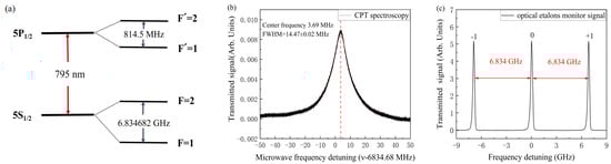 (a) Relevant energy level diagram of rubidium-87 atoms D1 line; (b) the CPT spectroscopy detected by PD1 in Figure 1 for 6.8 GHz micro-wave frequency optimization; (c) the transmission spectra of the optical etalon for 6.8 GHz micro-wave power optimization. The height of the +1-order and −1-order sideband peaks is roughly equal to that of the carrier peak in center.