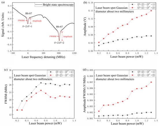 BSS and parameter optimization. (a) Rubidium 87 with different hyperfine BSS; (b) signal amplitude vs. laser beam power; (c) linewidth vs. laser beam power; (d) amplitude/linewidth vs. laser beam power.