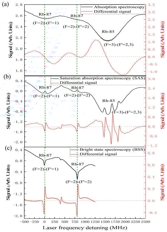 Atomic absorption signal (black) and differential signal (red). (a) The absorption spectroscopy of the laser beam through the rubidium vapor cell; (b) saturation absorption spectroscopy (SAS); (c) bright state spectroscopy (BSS).
