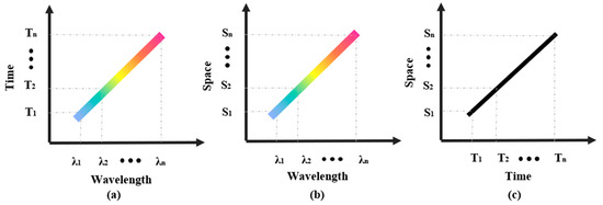 Serial time-encoded amplified microscopy (STEAM) is one typical TS imaging approach, with an unprecedented imaging speed of tens of hundreds of million frames per second [19,20,21,22], which conquers the bottleneck of the tradeoff between imaging speed and sensitivity. STEAM mainly contains two procedures. The first procedure is called wavelength/spectrum-to-time conversion, also called TS or dispersive Fourier transformation (DFT) or wavelength/spectrum-to-time one-to-one linear mapping, which is resulted from the application of temporal dispersive devices, such as long-distance single-mode fibers or dispersive compensating fibers (DCF) [23]. Figure 1a shows the one-to-one linear mapping between wavelength and time. The other procedure is called space-to-wavelength/spectrum conversion, also known as the space-to-wavelength/spectrum one-to-one linear mapping, which is induced by the utilization of spatial dispersive devices, such as gratings or virtually imaged phased arrays (VIPAs) [24,25]. Figure 1b shows the one-to-one linear mapping between wavelength and space. From the above two procedures, a linear mapping between space (imaging information) and time (1D time serial information) is achieved. Figure 1c shows the one-to-one linear mapping between time and space via the wavelength. By analyzing the 1D time serial information, the imaging information of the original image can be reconstructed.