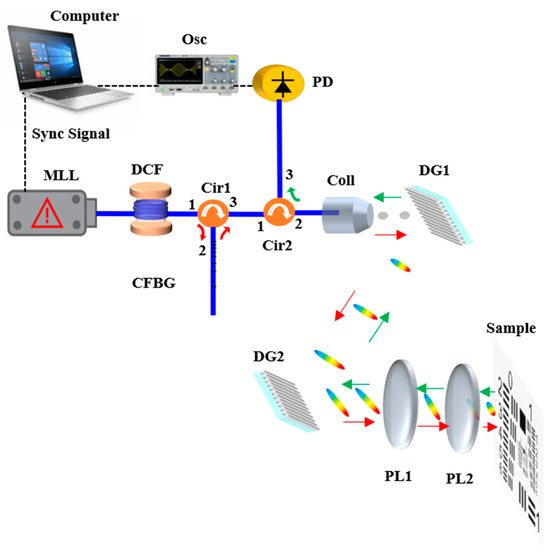 The schematic of the proposed ultrafast optical imaging system with AT is shown in Figure 4. A MLL with an average power of 10 dBm and a repetition rate of 50 MHz is utilized as the laser source to generate the broadband femtosecond optical pulses with a duration of less than 80 fs and a center wavelength of around 1550 nm. The femtosecond optical pulses with a FWHM of 15 nm in the spectrum domain go through the DCF with a dispersion of −0.48 ns/nm, where the femtosecond optical pulses are time-stretched into a nanosecond level, and the linear one-to-one mapping between wavelength/spectrum to time is achieved. Hence, the wavelength/spectrum information is encoded into the time serial. The time serial-encoded and time-stretched optical pulses then pass through the circulator 1 (Cir1) from port 1 to port 2 and then reflect back to port 3 of the circulator via the CFBG, where the optical pulses are nonlinear-stretched. The optical pulses are reshaped by the CFBG, which has a nonlinear group delay profile. The reshaped optical pulses then go through the circulator 2 (Cir2) from port 1 to port 2, emit into open space via a collimator (Coll), and then go through a pair of diffraction gratings (DG1 and DG2), which have a groove density of 600 lines per millimeter. When using two DGs at a parallel setup, the rainbow pulses will be collimated (shown in Figure 4; the tilted angle of the rainbow pulses indicating that different wavelengths of the rainbow pulses reach the sample at different times), which is easy for the following light adjust and imaging. DG acts as the spatial dispersive device in the proposed imaging system. Thanks to the utilization of DGs, a linear one-to-one mapping between spectrum/wavelength and space is obtained.