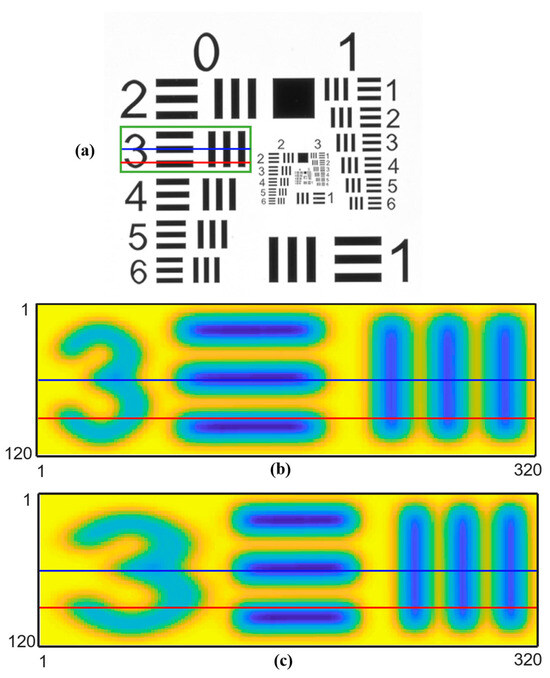 The experimental results of reconstructed images using the normal TS technique and the proposed AT approach are described in Figure 5. Figure 5a shows the original standard 1951 USAF resolution target with an imaging region marked in the green square, which has an imaging field of view (FOV) of 2.4 mm by 6.4 mm and a pixel size of 120 × 320. Figure 5b,c show the results of reconstructed 2D images using the normal TS technique and the proposed AT approach, respectively. Figure 5b indicates that the uniform group delay of temporal dispersive devices used in the TS technique produces an identical imaging result to the original resolution target. In contrast, Figure 5c shows an anamorphic image with more details in the dense information region (group 0, number 3) and coarse information in the spare area of the target image thanks to the utilization of the nonuniform group delay of temporal dispersive devices, which is specially designed as a low group delay in the dense information region and a high group delay in the rest of the imaging area. Compared with Figure 5b, Figure 5c has improved group delay-related resolution by 58% [22] and more acquired data show the dense information region of group 0, number 3, which could give more details about the edges.