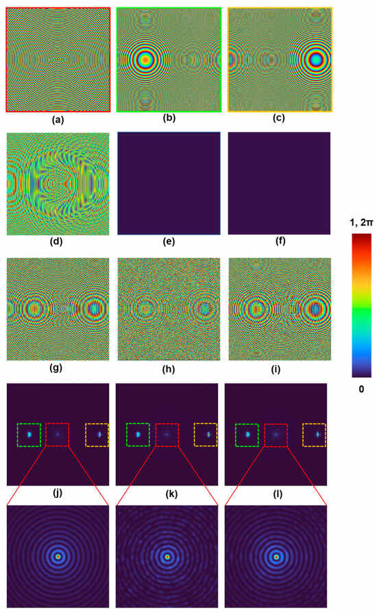The magnitude of the CMs obtained by the sum of the three phase-only functions of the diffractive axicon, FZP1 with LP2, and FZP2 with LP3, random multiplexing, and the TAP-GSA with a degree of freedom of 0.16 are shown in Figure 2d, Figure 2e, and Figure 2f, respectively. The phase of the CMs obtained by the sum of the above three phase functions, random multiplexing and the TAP-GSA with a degree of freedom of 0.16 are shown in Figure 2g, Figure 2h, and Figure 2i, respectively. The diffraction pattern obtained at a distance of 0.2 m from the CM for the above three cases are shown in Figure 2j, Figure 2k, and Figure 2l, respectively. The magnified regions of the intensity matrices for the above three cases show a reduced scattering noises with the TAP-GSA. It must be noted that the case of Figure 2j for a complex CM does not have any noise as it is the ideal CM. However, such a complex CM cannot be realized using the current state-of-the-art spatial light modulators, as they are either amplitude-only or phase-only modulators. Therefore, the complex CMs are converted into approximate amplitude-only or phase-only CMs. Random multiplexing is one such method that is used for approximating a complex CM by a phase-only CM. However, this approach results in substantial scattering noises and a low light throughput, as seen in Figure 2k. This problem was addressed in our recent study, and a new approach, the TAP-GSA, was developed to approximate a complex CM by a phase-only CM with significantly lower scattering noises and improved light throughput [29]. As seen in Figure 2l, the scattering noises are lower than those of the random multiplexing shown in Figure 2k. However, the scattering noises of Figure 2l are slightly higher than those of the ideal complex CM.