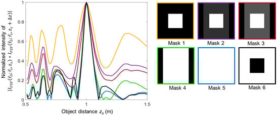 The axial behavior is simulated next. The IPSF is simulated for different values of zs and processed with IPSF corresponding to a single value of zs as , where zs = 1 m and Δzs is tuned from −0.5 m to 0.5 m. The normalized curves of for six cases of masks applied to recordings are shown in Figure 3. The FWHM of the normalized curves for Masks 1 to 6 are 0.19 m, 0.15 m, 0.13 m, 0.09, 0.08, and 0.08, respectively, indicating a gradual increase in the axial resolution, with the maximum and minimum values corresponding to the axicon and lens, respectively. It can be seen that by selecting an appropriate mask, different strengths of axial correlation lengths can be contributed from different areas of the recordings, resulting in the desired effective axial resolution.