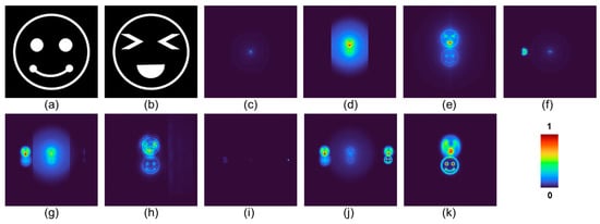 The simulated optical experiments are discussed next. Two ‘smiley’ objects were selected for the study, as shown in Figure 4a,b. The two objects were separated by a distance of 20 cm. Even though there are clear variations in the curves shown in Figure 3 for different cases of the masks, in imaging it is challenging to observe minor changes in axial resolution. Therefore, for the simulation study, only three cases are considered, corresponding to Mask1, Mask2, and Mask4. The images of the simulated IPSFs, IROIs, and IRs for Mask1, Mask2, and Mask4 are shown in Figure 4. From the results, it can be seen that the axial resolution increases from Mask1 to Mask4. The reconstructed second smiley object—test object 2—becomes more and more blurred with an increase in the axial resolution. For all the above cases, the LRRA is applied with three to five iterations, with α = 0, β = 0 to 0.2. When the axial resolution is increased, the strength of the object’s image in planes other than the plane of interest becomes weaker and blurred. In this simulation study, the plane of interest is where object 1 is located, and therefore with an increase in the axial resolution, the image of object 2 becomes more blurred and weaker in Figure 4k compared to Figure 4e,h. However, object 1 is expected to be focused for all three cases, as it is located in the plane of interest. The simulation results show that object 1 appears focused for all three cases.