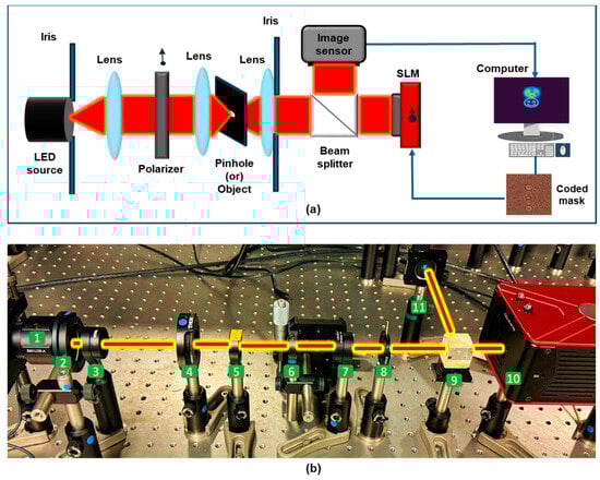 (a) Schematic and (b) photograph of experimental configuration. (1) LED, (2) iris, (3) refractive lens (f = 3.5 cm), (4) polarizer, (5) refractive lens (f = 5 cm), (6) object/pinhole, (7) refractive lens (f = 5 cm), (8) iris, (9) beam splitter, (10) spatial light modulator, (11) monochrome image sensor.