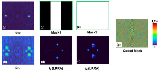 The light from the LED is controlled by an iris and collimated by an RL (f = 3.5 cm). The collimated beam is passed through a polarizer, which is oriented along the active axis of the SLM. Two objects are created by shifting a pinhole of 50 μm in horizontal and vertical directions. Object 1 (two points along the horizontal direction separated by 120 μm) and object 2 (two points along the vertical direction separated by 120 μm) are created. The object is critically illuminated by an RL (f = 5 cm). The light beam from the object is collimated by an RL (f = 5 cm), and the beam size is controlled by another iris. The collimated light beam enters the BS and is incident on the SLM. The CM is created by combining two FZPs (with a focal length of 16 cm) and one diffractive axicon (with Λ = 187 μm) using the TAP-GSA with a degree of freedom of 75% similar to the simulation study as shown in Figure 2i. The phase-only CM from the TAP-GSA is displayed on the SLM, which modulates the light beam, creating the diffraction spots of the two FZPs and diffractive axicon at predefined locations on the image sensor. The IPSF and IROI are recorded by the image sensor located at a distance of 20 cm from the SLM. The IPSF is recorded using a 50 μm pinhole. Object 1 and object 2 are recorded at two different depths, zs = 5 cm and zs = 5.4 cm, respectively. The object information is reconstructed by processing IPSF and IROI using the LRRA. The experimentally recorded IPSF and IROI are shown in Figure 6a and Figure 6b, respectively. Two masks, Mask1 and Mask2, are applied to the recorded IPSF and IROI and reconstructed. The images of Mask1 and Mask2 and the reconstructed images are shown in Figure 6c, Figure 6d, Figure 6e, and Figure 6f, respectively. The phase image of the CM generated using the TAP-GSA with degrees of freedom of 75% is shown in Figure 6g. Comparing the reconstruction results of Figure 6d,f, the axial resolution of Figure 6f is better than that of Figure 6d, demonstrating the tunability of axial resolution post-recording. In the case of Mask1 (Figure 6c), there is contribution only from the diffractive axicon, which has a long axial correlation length, resulting in a low axial resolution. In the case of Mask2 (Figure 6e), there is contribution from two FZPs and a diffractive axicon, resulting in a short axial correlation length. The shorter correlation length for Mask2 arises due to the averaging effect of correlation lengths corresponding to the diffractive axicon and FZPs. However, in the above two cases, the lateral correlation length is the same, as the NA is constant for both cases. In all the above cases, the typical range of α, β and the number of iterations for LRRA are 0 to 0.4, 1, and 10 to 30, respectively. The experimental results are matched with the simulation results and validate the theory of SEM-CAI.