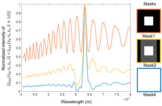 In terms of the developed SEM-CAI, even though it has been demonstrated only for tuning axial resolution independent of lateral resolution, the concept can be extended to tuning spectral resolution independent of lateral resolution as well. Simulation results for tuning spectral resolution post-recording using a monochrome sensor for three masks, Mask1, Mask2, and Mask4, were obtained. The spectral correlation curves obtained from for a wavelength variation between 400 to 800 nm for the three masks are shown in Figure 7. As can be seen, the spectral resolution improves from Mask1 to Mask4. The same approach can also be used to tune the lateral resolution, which has not been discussed in [27,28] and, so far, is not possible after recording a picture or a video. However, a low lateral resolution does not have any useful application.