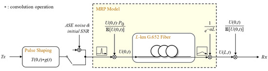 Here, represents the total number of terms converted from integration to summation, which is also the total number of branches of the RP model, is the additional step size considered for each summation term, is the effective length of the optical fiber, and f(l) is the attenuation term of the optical fiber. Note that on the basis of the RP model, we have added a learnable parameter (n = 0~). Additionally, we have adjusted the step size, , to become a learnable real parameter, and we refer to this improved model as the MRP model. For , when n = 0, it corresponds to the zeroth-order equation solution, so is a learnable parameter of complex value. can control the power ratio between the linear and nonlinear parts in the MRP model. When n = 1~, it corresponds to the solution of the first-order equation, where is a learnable parameter of complex value that can control the magnitude of the nonlinear amplitude and phase shift in each branch. Figure 1 shows the mathematical model of a single-span fiber optic communication system considered in our work.
