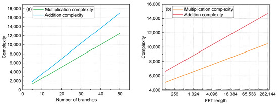 It is evident that the complexity of the MRP model is directly proportional to both the number of branches and the length of the input sequence. It is worth noting that FFT is the main source of algorithm complexity. For sequences with a length of S = 4096, the number of multiplication and addition used by radix-2 FFT accounts for 84% and 61% of the total number of multiplication and addition in the MRP model, respectively. In addition, we remind readers that using the calculation method of base radix-4 FFT can further reduce the complexity of the algorithm. Under the same sequence length, S, radix-4 FFT can reduce the number of multiplications to 3/4 as opposed to radix-2 FFT. In addition, when calculating both x-polarization and y-polarization simultaneously, the results of mode squared can be reused to reduce computational complexity.