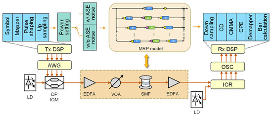We consider a standard single-mode fiber with a span of L = 120 km, transmitting a dual-polarized 50-GBaud signal. The wavelength of lasers is 1552.6 nm. Table 1 shows the fiber’s parameters, which will be applied to all models mentioned in this chapter, including SSFM, RP and MRP models. We intentionally chose a larger group velocity coefficient, , to demonstrate that even when the symbol length affected by nonlinear inter-symbol interference is longer, the model’s performance remains strong. We also note that using other reasonable dispersion values does not significantly impact the improvement in model performance. For the signal output by the model, we process the waveform-wise signal through a standard DSP process to remove linear distortion in the fiber optic, its specific structure is shown in Figure 4.