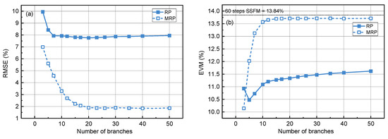 RMSE (a) and EVM (b) of the MRP and RP models under different branch numbers.