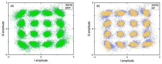 Constellation diagrams comparison between SSFM and (a) MRP or (b) RP models.
