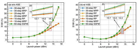 Figure 8 shows the relationship between RMSE and launch power for RP and MRP with different numbers of branches. Here, a 60-step SSFM is used as the standard quantity for calculating RMSE. It is obvious that the fitting error between the MRP model and SSFM is smaller in the large launch power range than standard RP. Taking the results at 14 dBm as an example, the RMSE of the 30-step RP model is 11.82%, while the RMSE of the 30-step MRP model is only 2.77%, reducing the error by more than 75%, and the computational complexity of the two models is completely the same. As we have already gone through the standard DSP process and the same normalization process before calculating RMSE, the error here is almost entirely composed of nonlinear differences. If factors such as phase rotation are considered, the performance gap between the RP model and the MRP model will further increase. In practical systems, both the signal and amplifier are not ideal. Due to the presence of ASE noise and arbitrary waveform generator AWG sampling noise, the signal at the transmitting end is modeled as the sum of ideal signal and Gaussian noise. Nonlinear effects will occur between the noise and signal, resulting in the Gordon–Mollenauer Effect [46]. To verify the accuracy of the model’s estimation of non-ideal signals, we set the initial signal-to-noise ratio of the signal to 37 dB, and we consider an additive Gaussian noise of a constant power of 0.01 mW before entering the fiber to simulate sampling noise and ASE noise separately. Note that we use multiple independent Gaussian noise sources to ensure that the sum of the noise remains Gaussian distributed. Figure 9 shows the accuracy of the model in estimating the received signals’ EVM without and with ASE noise. When the launch power is large, the MRP model is significantly better than the RP model. In addition, we found that both the RP model and MRP model tend to underestimate the EVM of the signal, and the underestimation degree of the MRP model is significantly lighter than that of the RP model. At a launch power of 13 dBm with ASE noise, the EVM difference between the 20-step MRP and SSFM is only 0.13%, which is much lower than the 2.51% corresponding to the 20-step RP model. Moreover, this difference will further expand with the increase in fiber launch power.