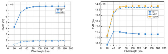 (a) RMSE and (b) EVM of the MRP and RP models under different fiber lengths (launch power = 13 dBm, MRP branches number = 20).