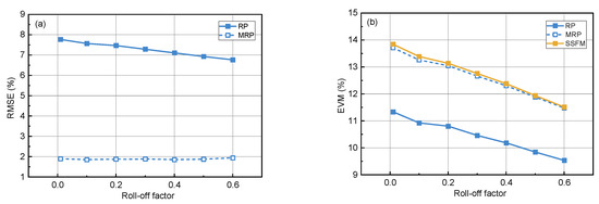 (a) RMSE and (b) EVM of the MRP and RP models under different roll-off factors (fiber length = 120 km, launch power = 13 dBm, branches number = 20).