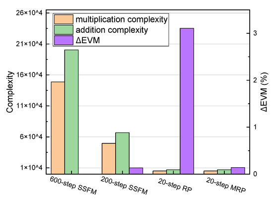 Computational complexity and ΔEVM of the SSFM and MRP or RP models (fiber length = 120 km, launch power = 13 dBm, sequence length S = 8192).