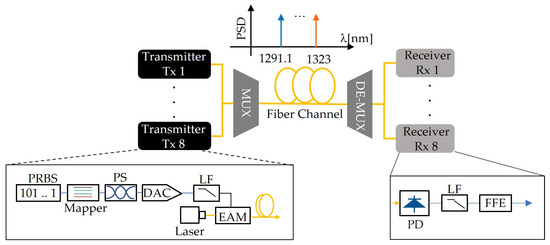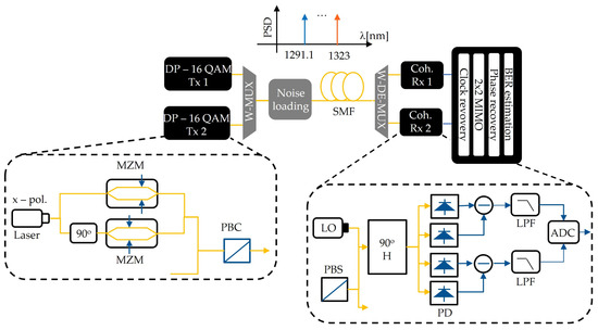 The simulation environment used for the coherent link is depicted in Figure 8. On the transmission side, two DP-16QAM transmitters using two LWDM wavelengths that are operated at 120 GBaud are used for transmission. The electrical signal generation follows a similar approach used in [19], where low-pass filters emulate the limitation imposed by the digital to analog converter (DAC—2nd order Bessel), Mach–Zehnder modulator (MZM—Gaussian filter of order 0.5), electrical driver (4th order Bessel) and analog to digital converter (ADC—2nd order Bessel). However, 60 GHz bandwidth components are used to accommodate the requirements of higher symbol rates. In addition, no digital pre-emphasis is used to compensate for transmitter bandwidth limitations. The electrical signal is shaped using a square-root raised-cosine pulse shaping filter with a roll-off factor of 0.1 and is then processed by a DAC with 6-bit resolution and 2nd order Bessel type low-pass filter characteristics. The electrical signal amplifier has a 2nd order Bessel filter low-pass response, and the MZM has a Gaussian frequency response of order one. Each transmitter emits a fixed optical power with a fixed optical signal to noise ratio (OSNR), which is then multiplexed into the G652.D compliant standard single-mode fiber with a ZDW centered around 1312 nm. At the output of the fiber, a demultiplexer with a 4th order Bessel filter response is used to demultiplex both signals with a bandwidth of 240 GHz.