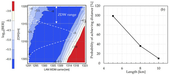 The objective of the analysis in this subsection is to understand the reach limitation imposed by CD. For this purpose, all non-linear interactions occurring in the fiber will be turned off. Each transmitter will emit an output power of 0 dBm. Because the CD is different for each transmission wavelength due to its wavelength separation from the ZDW, the results will be shown as function of ZDW for each transmission wavelength. Figure 2a shows the transmission performance of each wavelength at a fixed distance of 10 km. As expected, the further away a transmission wavelength is from the ZDW, the higher the BER is due to its higher CD value. Figure 2a outlines the importance of the ZDW, as its value will affect transmission performance for all channels. Using this LWDM-8 system architecture and assuming a FEC BER threshold of log10(BER = 2.2 × 10−4) = −3.6 as a criterion to define whether a channel is usable for transmission, a ZDW range of 5 nm is found, as depicted in Figure 2a, in which all channels achieve good performance. This range, however, does not consider the probability distribution of the fiber’s ZDW. If the overlap between the ZDW range and the probability density distribution of the fiber’s ZDW is considered, the probability of achieving the desired transmission distance can be computed as: