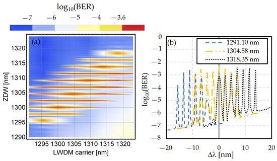 (a) log10(BER) as function of ZDW and LWDM carrier for 2 km distance; (b) log10(BER) as function of relative distance to the ZDW defined as Δλ = λ1\5\7 − λZDW for three different transmission wavelengths.