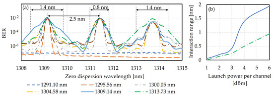 For λtx,5 = 1309.14 nm, as depicted in Figure 4a with a light blue solid line, the interaction range within one oscillation is 1.4 nm if the KP4 FEC threshold of 2.2 × 10−4 is used. The interaction range is defined as the wavelength range where the BER is above the FEC threshold. Similar results are obtained for λtx,6 = 1313.73 nm, depicted with a green dash dot line, where the ZDW overlaps with the value of λtx,6. In addition, the FWM penalty can also increase near the middle of two LWDM wavelengths with narrower FWM interaction widths of 0.8 nm. As this behavior is launch power dependent, the width is evaluated as a function of launch power per channel as shown in Figure 4b. The blue curve shows the value for the FWM interaction range for λtx,5 = 1309.14 nm when the ZDW is tuned from 1308–1311 nm. The green curve corresponds to the FWM interaction range for λtx,5 = 1309.14 nm when the ZDW is tuned from 1311–1312 nm.
