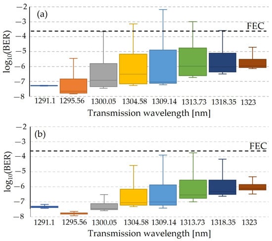 Figure 5a,b show the evaluation of the Monte Carlo simulation for cases one and two, respectively, for a power level of 2 dBm. Here the data have been smoothed with a Gaussian filter of length 2. As depicted in each case, 75% of all evaluations are below the FEC threshold. However, for case one, wavelengths 4, 5 and 6 exhibit values that exceed the FEC threshold and can cause an outage.