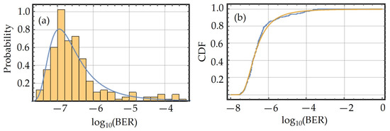 where the cumulative distribution function (CDF) for each transmission wavelength i is evaluated at the value of log10(BER) = −3.6. It is important to note that for higher BER values, the empirical CDF is used. For lower BER values a distribution function is fitted to the data. An example of the probability distribution function (PDF) and the cumulative distribution (CDF) function fitted to a set of data is shown in Figure 6a,b, respectively, for channel 5 using a 2 km long fiber. To find the best fit distribution, a methodology is adopted that is used in wireless channel modeling [16], known as the goodness of fit test, which examines whether the data observed are accurately described by the assumed distribution function. The Cramer–von Mises method is used to evaluate the goodness of fit [17] by comparing the empirical CDF to the assumed CDF. The evaluation is performed using Mathematica’s function CramerVonMisesTest. A significance level p above 0.05 is used to decide whether the hypothesized CDF describes the data with high probability. The distribution functions describing the data most frequently are the Fréchet, Weibull or extreme value distributions, as they capture the long tail of the data the most accurately.